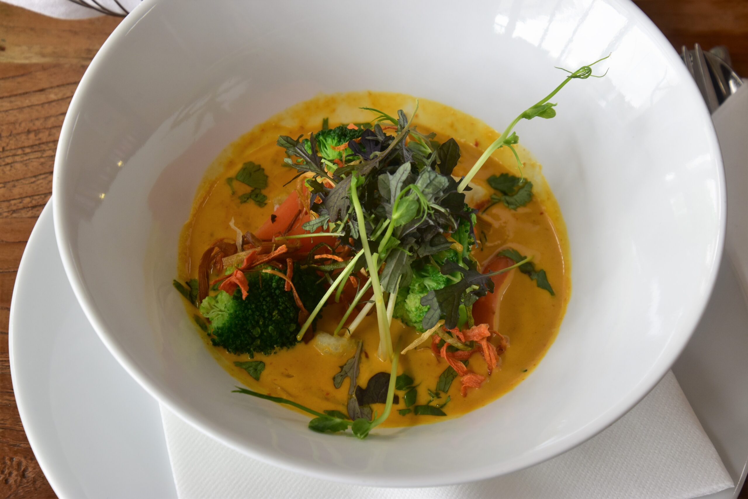 Al Trivio ristorante v Club House v Penati Golf Resort – urobili thajske red curry so zeleninou. Chutovo vyborne dochutene, ale najprv mi povedali, ze veganske nic nemaju a ani nevedia nic pripravit. Dost ma to na takom drahom mieste, ako je golfove ihrisko, prekvapilo. Nakoniec po dlhsom vysvetlovani co ako vegan mozem a co nemozem jest, mi predsa len pripravili zeleninove kari, a bolo na jednicku!