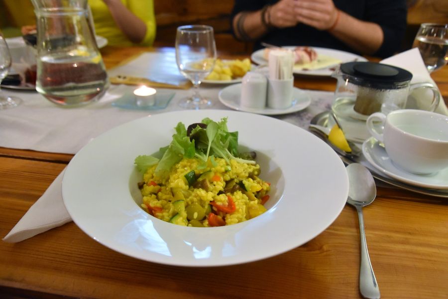 Restauracia Jozef II. v Holici – dobra strava na domacky sposob. Narychlo som si vypytala zeleninovu polievku, lebo sme sa riadne vymrzli a zmokli niekolkokrat, tak som sa chcela ohriat. Hlavne jedlo som uz nechala na sefkuchara, hlavne, nech bude veganske a bezlepkove. Pripravili mi vyborne safranove rizoto s hubami a zeleninou a zeleny salat k tomu. Rychle, jednoduche a dobre dochutene.