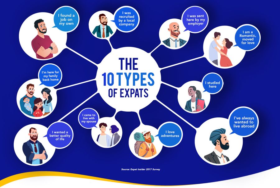 There are several reasons why people live outside their home country. The Expat Insider Survey listed the Top 10 reasons why people move abroad . Some of them are foreign assignments, moving with spouses, education, adventure etc. The infographic by InstaReM pictorially categorises all the types of expats.